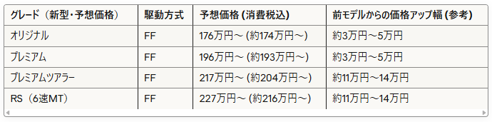 価格の上昇幅は、標準グレードで3万円〜5万円ほど、上位グレードの「プレミアムツアラー」や「RS」では11万円〜14万円ほどとされ、全体で約10万円程度のアップが予想されます。