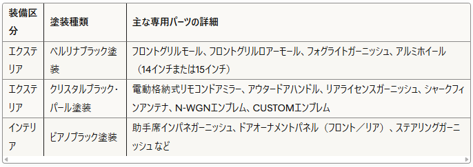 装備・室内空間 | 「CUSTOM L」の装備に加え、専用のブラックコーディネートが施されます。特に内外装のブラックアクセントが、通常のカスタムとは一線を画す存在感を放ちます。 |