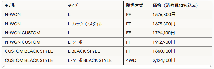 - 価格帯: 1,860,100円(L BLACK STYLE FF)〜 2,124,100円(L・ターボ BLACK STYLE 4WD)。