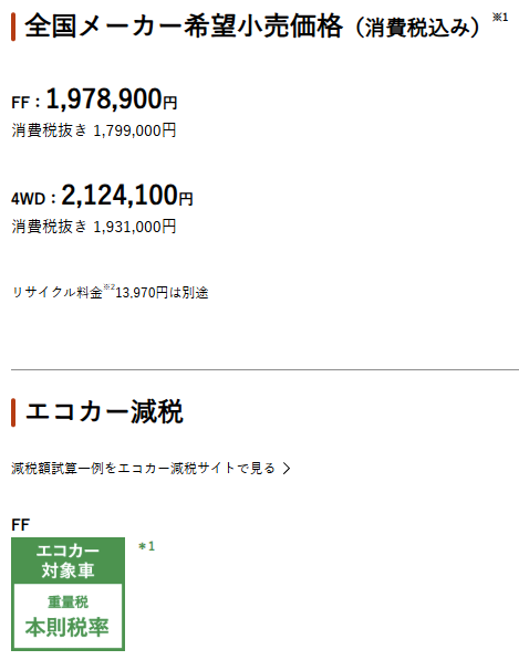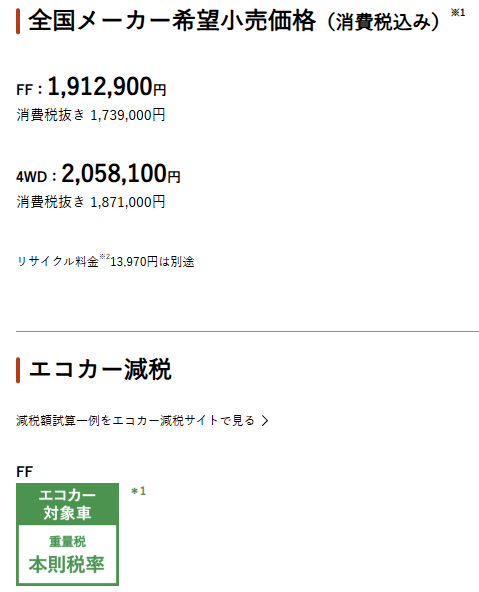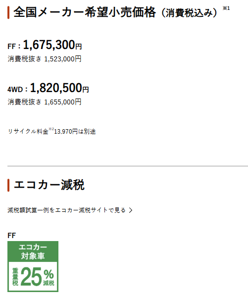 - 価格帯: 1,675,300円(FF)〜 1,820,500円(4WD)。