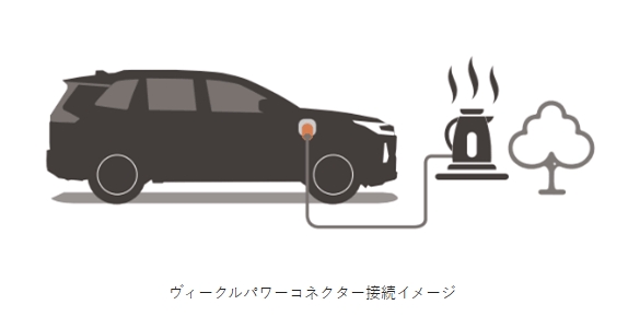 ラゲージに設置されたコンセントによる車内給電に加え、付属のヴィークルパワーコネクターを充電インレットに差し込むことで、車外でも合計1,500Wまでの電化製品が使用可能になる。