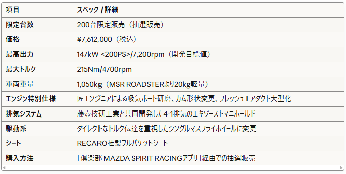 2025年10月4日、マツダは正式にこの両モデルの予約受注を10月24日より開始すると発表しました。価格はMAZDA SPIRIT RACING ROADSTERが526万5,700円で限定2,200台、そしてMAZDA SPIRIT RACING ROADSTER 12Rが761万2,000円で限定200台という設定です。