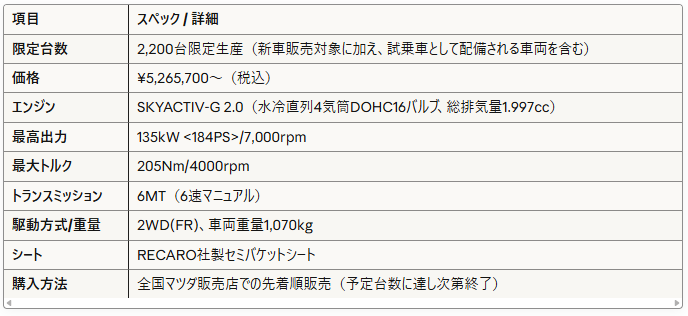 - MSR ROADSTER(184PS/2,200台限定): 全国のマツダ販売店にて先着順受付