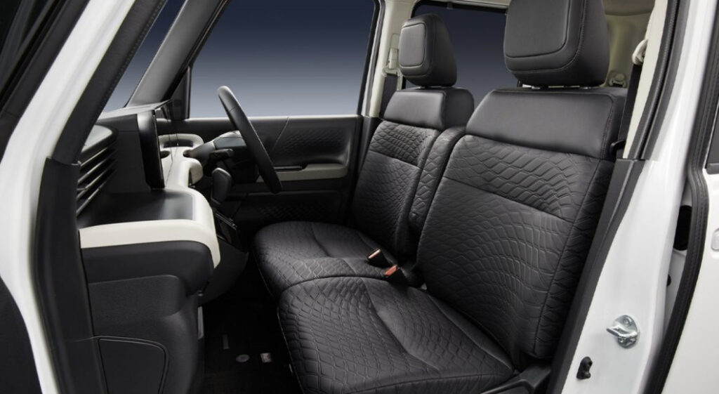 合成皮革の採用は、近年多くの車種で見られますが、「防水性」に特化している点は特筆すべきです。通常のファブリックシートでは、一度液体をこぼすと完全に乾燥させるのが難しく、臭いやカビの原因となることもあります。防水合皮は、そうした衛生面での不安を解消しつつ、見た目の高級感も維持できるため、軽自動車というカテゴリーでこの素材を専用採用したNMCの選択は、ユーザーニーズを深く理解している証拠と言えるでしょう。また、冬場の冷たさや夏場の蒸れといった合皮の弱点に対して、通気性の良い構造やシートヒーター(オプションまたは上位グレード)の組み合わせで、どのように快適性を確保しているのかも注目したい点です。
