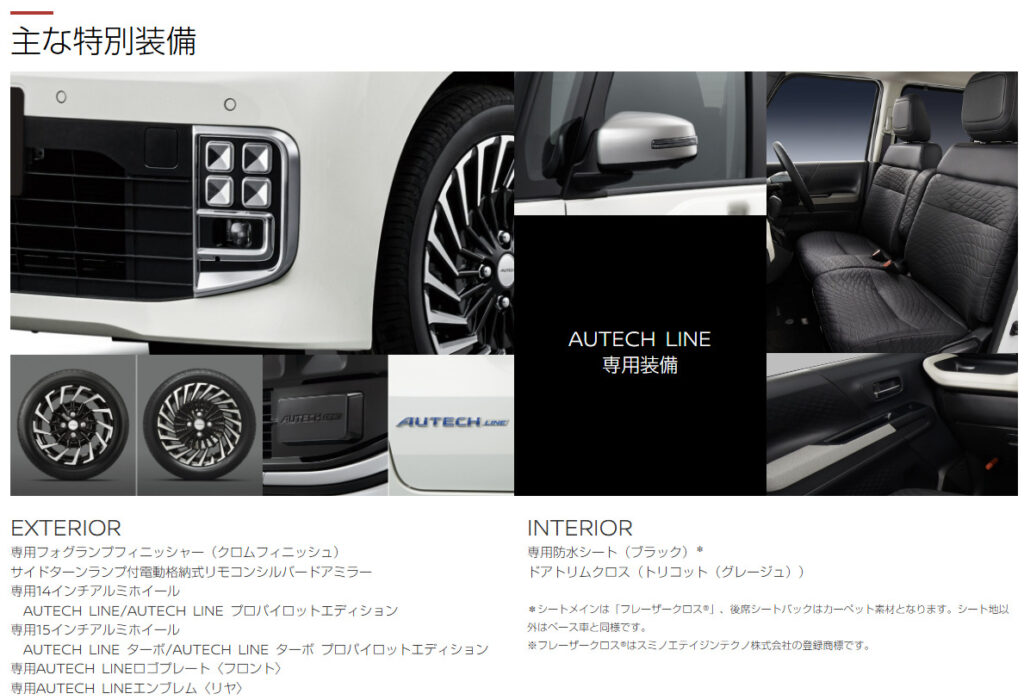 エクステリアデザインにおいて、特に軽自動車ではホイールサイズの選択が重要です。NA車で14インチの専用デザインホイールを採用することで、ターボ車の15インチ(もしくはそれ以上)とは異なる、よりコンフォートで上品な印象を与えつつ、車両全体のデザインコンセプトとの整合性を図っています。また、フォグランプフィニッシャーやドアミラーの色使いなど、細かなパーツにまで「AUTECH」のアイデンティティを宿らせることで、車両全体の統一感を高め、所有欲を満たすデザインを実現しています。これは、パーツ単体ではなく、車両全体としての「見え方」を徹底的に追求した結果と言えるでしょう。