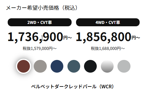 - 足回り: フルホイールキャップが装備されます。新色の「ベルベットダークレッドパール」などを選ぶことで、その上質感が際立ちます。