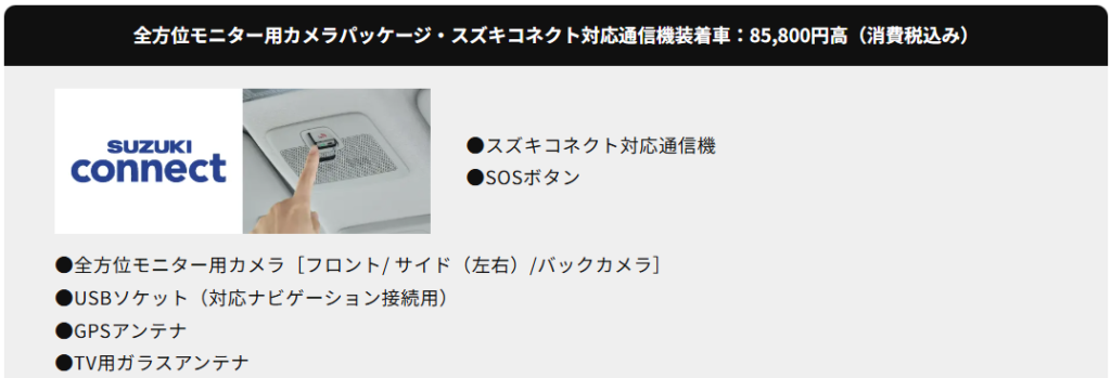 *全方位モニター用カメラパッケージ・スズキコネクト対応通信機装着車は、対応ナビゲーションの装着を前提とした仕様です。