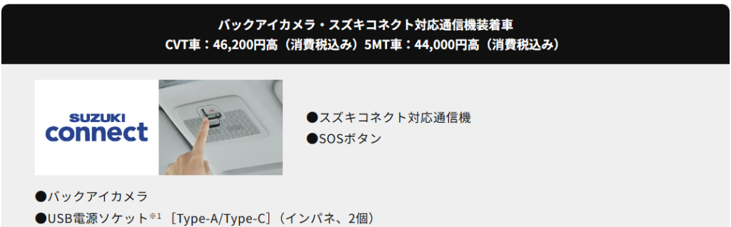 - オプション: スズキコネクトに対応しています。24時間365日の緊急通報やリモート操作機能を利用することで、さらなる安心感が得られます。