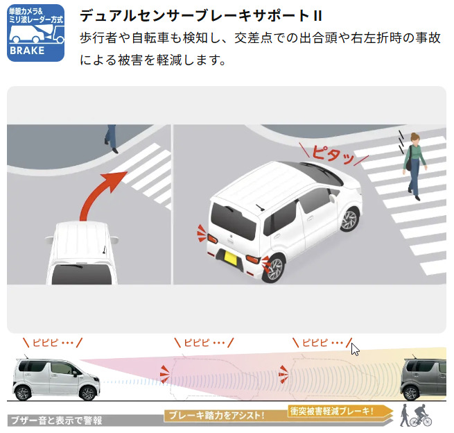 新型ワゴンRの最大の付加価値は、新世代安全システム「デュアルセンサーブレーキサポートII(DSBSII)」が全車標準装備された点です。