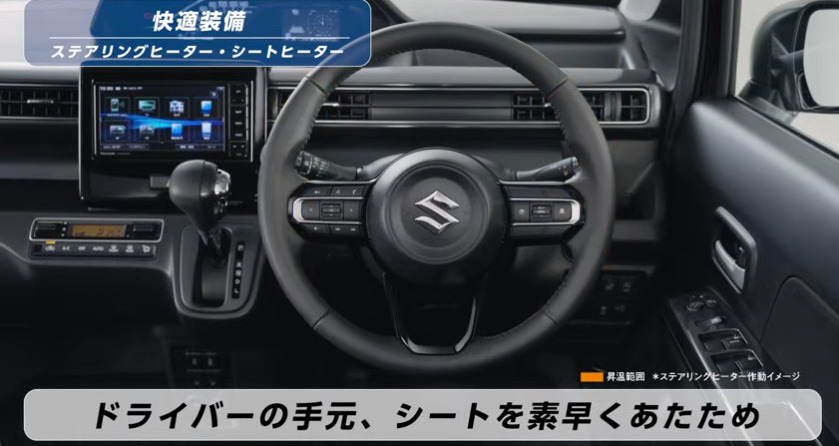 上位グレードの「HYBRID ZX」に標準装備されました。これはホンダN-BOXやダイハツタントにも採用されていない、スズキならではの「痒いところに手が届く」快適装備であり、寒冷地や冬季の運転において明確な競争優位性となります。ステアリングヒーターは、エンジン始動直後から素早く温まり、手袋なしでも快適に運転できる利便性が高く評価されています。