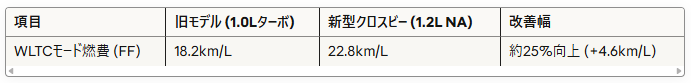 新型クロスビー(2025年10月2日マイナーチェンジ後)は、旧モデルで唯一のウィークポイントだった燃費性能を劇的に改善し、さらに安全性、内装の質感、そして走行の安定性を飛躍的に向上させました。
