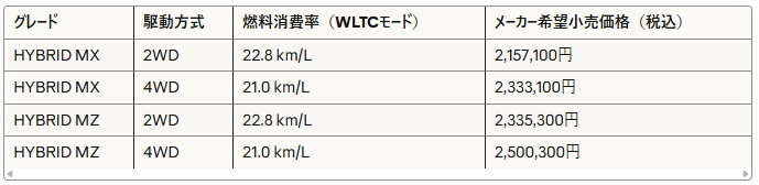価格は装備の充実に伴い現行モデルから値上がりしており、エントリーグレード「HYBRID MX」のFF車で+215,600円、4WD車で+246,400円となっています。一見すると大幅な値上げに見えるかもしれません。しかし、後述する新装備の内容を知れば、この価格設定が極めて妥当、いや、むしろお買い得とさえ言える理由が理解できるはずです。