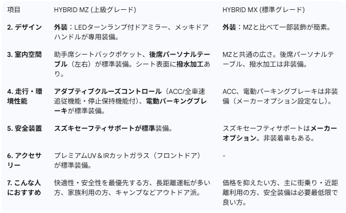 グレード別徹底比較:おすすめはどっち?【HYBRID MZ vs MX】