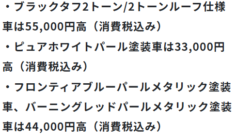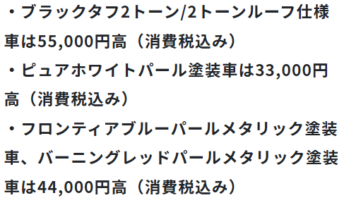 遊び心と力強さを兼ね備えた新色**「ミスティックブルーメタリック」**が導入されました。さらに、ルーフ・サイドカラーパネル・バンパーガーニッシュをブラックに統一した「ブラックタフ2トーン」を含む、2トーン9色、モノトーン4色の全13通りの豊富なカラーラインアップが用意されています。