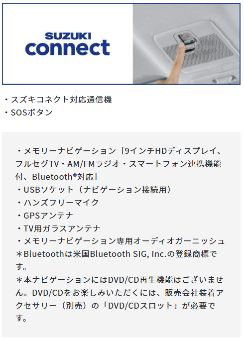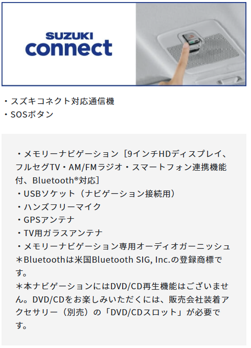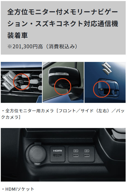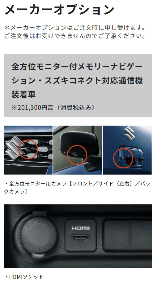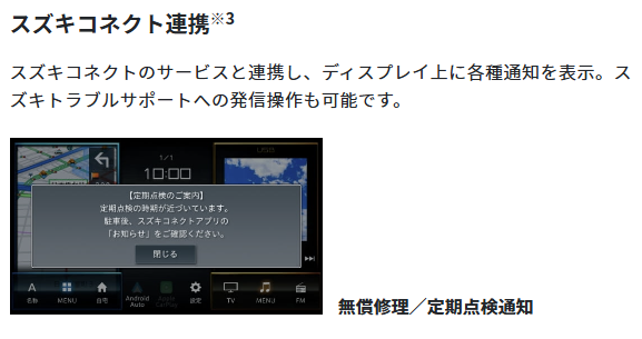 全方位モニター付メモリーナビゲーション・スズキコネクト対応通信機(メーカーオプション:201,300円)を装着することで、サービスを利用できます。このサービスは、初年度検査・登録年月から3年間無料です。