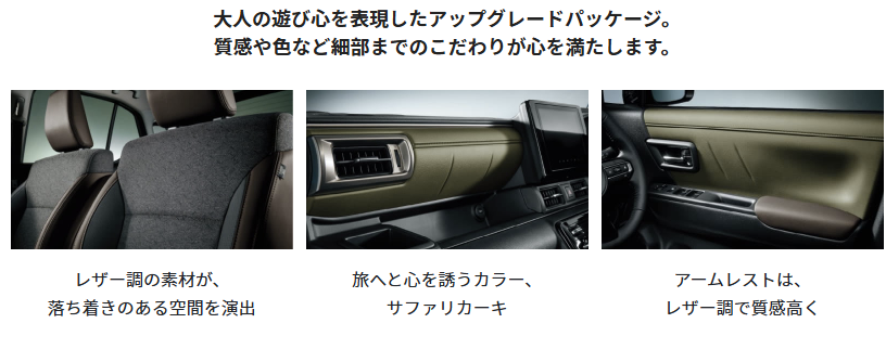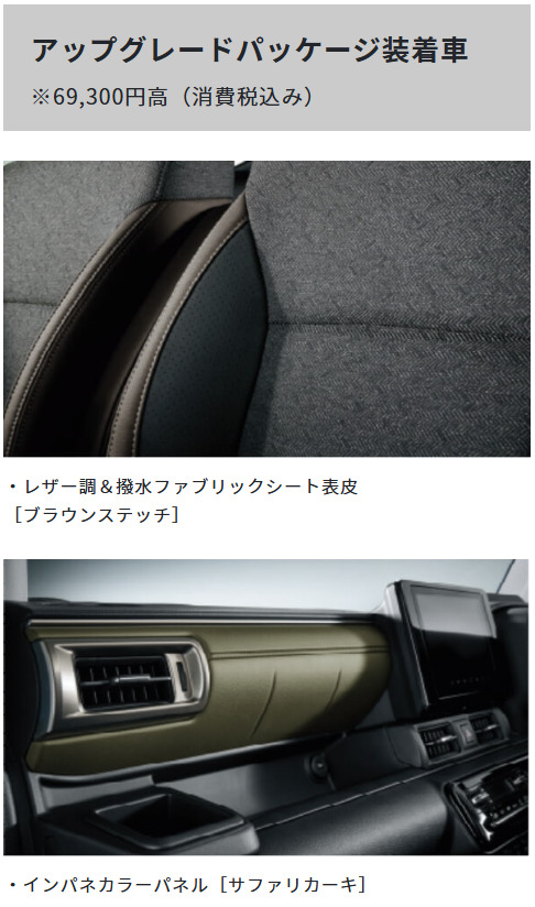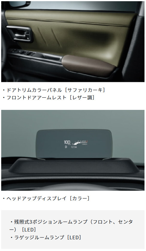 上位グレードのHYBRID MZには、レザー調&撥水ファブリックシート表皮、専用カラー(サファリカーキなど)のインテリアパネル、ヘッドアップディスプレイ、LEDルームランプをセットにした「アップグレードパッケージ」がオプション設定されています(69,300円)。