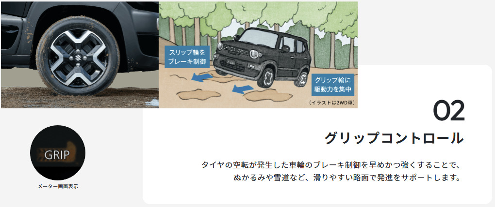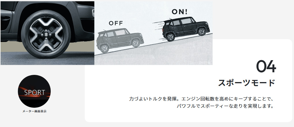 スズキセーフティサポート(衝突被害軽減ブレーキ、誤発進抑制機能、車線逸脱警報など)が標準装備となっており、安全・安心に乗りたい方にとっては必須のグレードです。