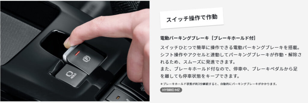 パーキングブレーキの作動・解除を指先で操作できる**電動パーキングブレーキ(ブレーキホールド付)**がHYBRID MZに採用され、信号待ちなどでの利便性が向上しました。