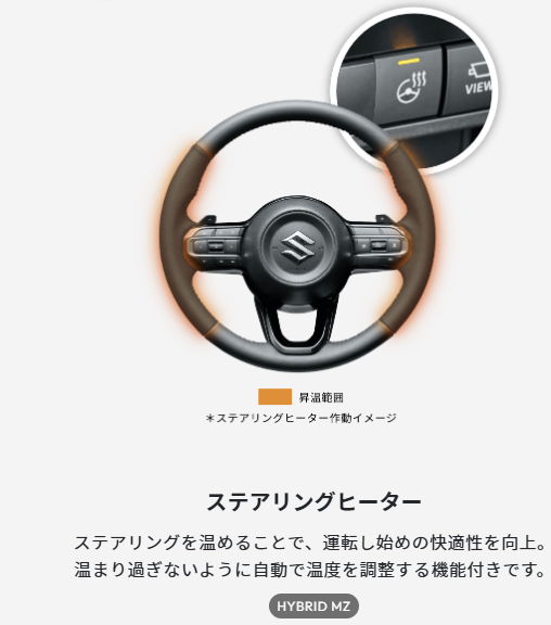 HYBRID MZには、寒い日の運転を快適にするステアリングヒーターが採用されました。