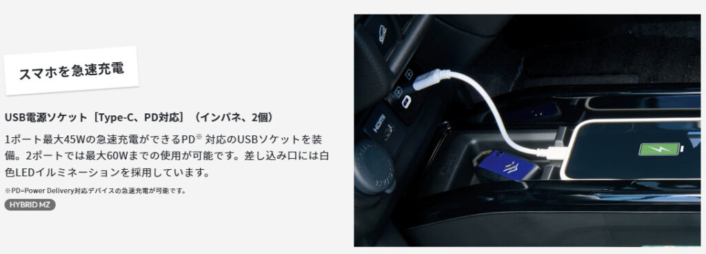 急速充電に対応したUSB電源ソケット[Type-C、PD対応](2個)もHYBRID MZに採用されています。