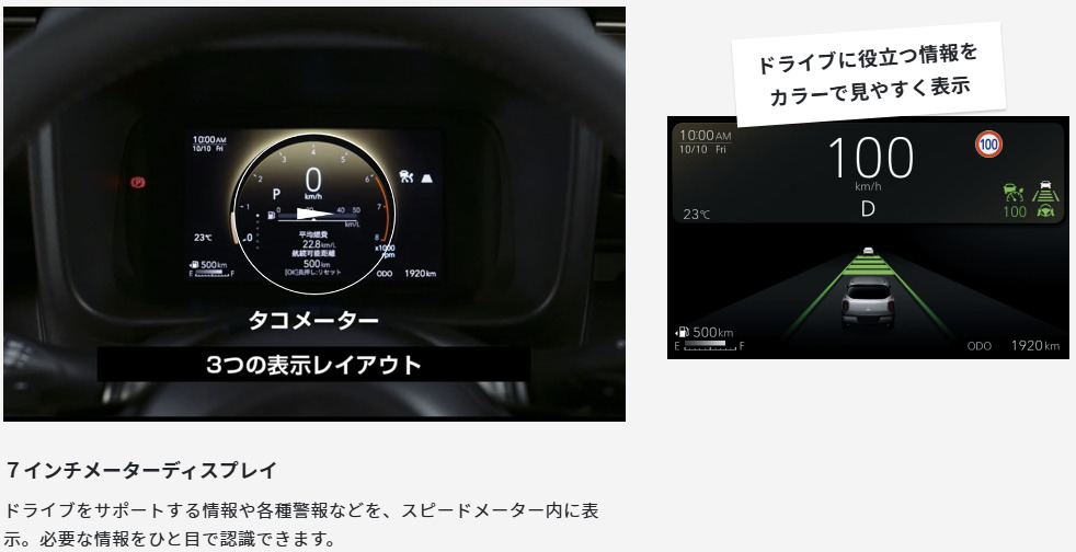 筆者が試乗した際、この7インチディスプレイの視認性の高さと情報の豊富さに驚きました。従来のアナログメーターでは表示しきれなかった情報が、分かりやすく整理されて表示されます。特に、安全装備の作動状況がリアルタイムで表示されるのは、ドライバーに安心感を与えます。