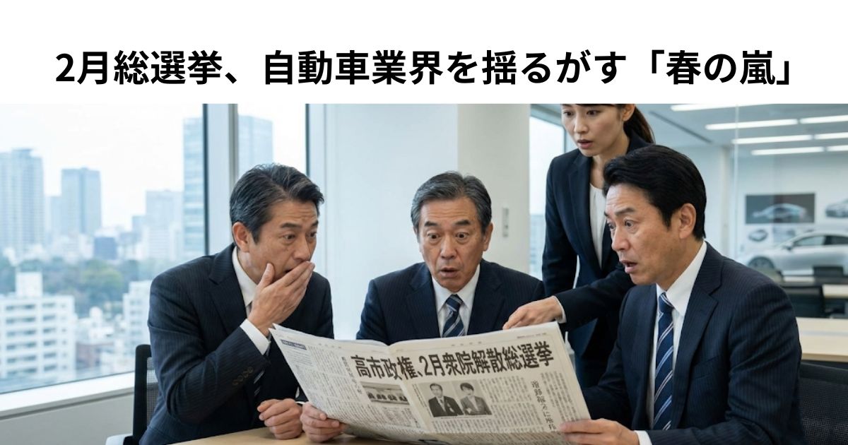 本記事では、自動車業界関係者が注視すべき「2026年2月総選挙」がもたらす影響の全容を、多角的な視点から徹底解説。政局の動きから税制の行方、販売現場への影響、さらには業界の取るべき戦略まで、あらゆる角度から深く掘り下げていきます。他の追随を許さない専門性と情報量で、自動車業界の最前線で働くあなたに、この「春の嵐」を乗り越えるための羅針盤を提供します。