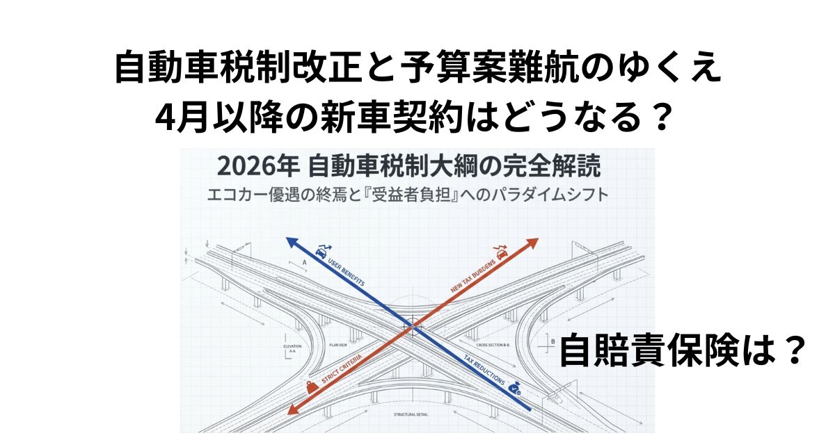 2026年4月から予定されている「自動車関係諸税の抜本的見直し」。環境性能割の廃止・軽油引取税の暫定税率廃止・エコカー減税の基準引き上げ——と、業界関係者にとってもユーザーにとっても、かつてないほど大きな変革が重なる年度となりました。「4月以降に買った方が安い」という期待が高まる一方、高市首相による通常国会冒頭の衆院解散という前代未聞の事態が予算案審議を直撃し、施行タイミングに不透明感が生じています。本記事では業界で仕事をする筆者の視点から、改正内容の本質・契約実務への影響・そしてEV課税の将来像まで、どこよりも詳しく解説します。
