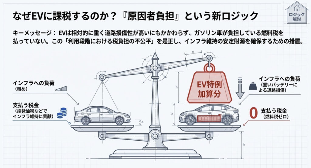 これまでEVは排気量ゼロのため、自動車税(種別割)は最低額区分(1,000cc以下ガソリン車相当)が適用されてきました。しかし現実には、バッテリーを多く積むEVは車重が2〜2.5トンに及ぶ重量級モデルも多く、道路への負荷はガソリン車以上です。また、ガソリン税(揮発油税)を一切負担していないという「応益負担」の観点からも、公平性への疑問が業界内外から提起されていました。