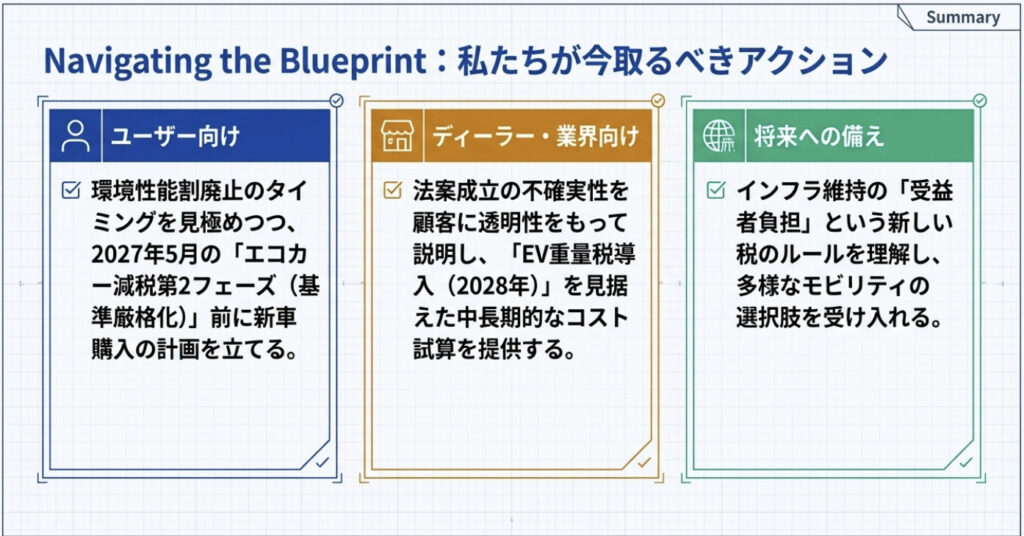 国会審議の動向は引き続き流動的ですが、今後のニュースを注視しながら、車種・タイミング・法案成立状況の3点を軸に最適な判断を行っていただければと思います。本記事は随時アップデートしていく予定ですので、ブックマークして活用いただければ幸いです。
