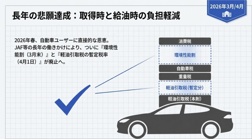 2019年の環境性能割導入、2025年のガソリン暫定税率廃止、2026年の環境性能割廃止・軽油暫定税率廃止、そして2028年のEV重量課税——これらを「点」ではなく「線」として捉えると、自動車税制がどこへ向かっているかが見えてきます。