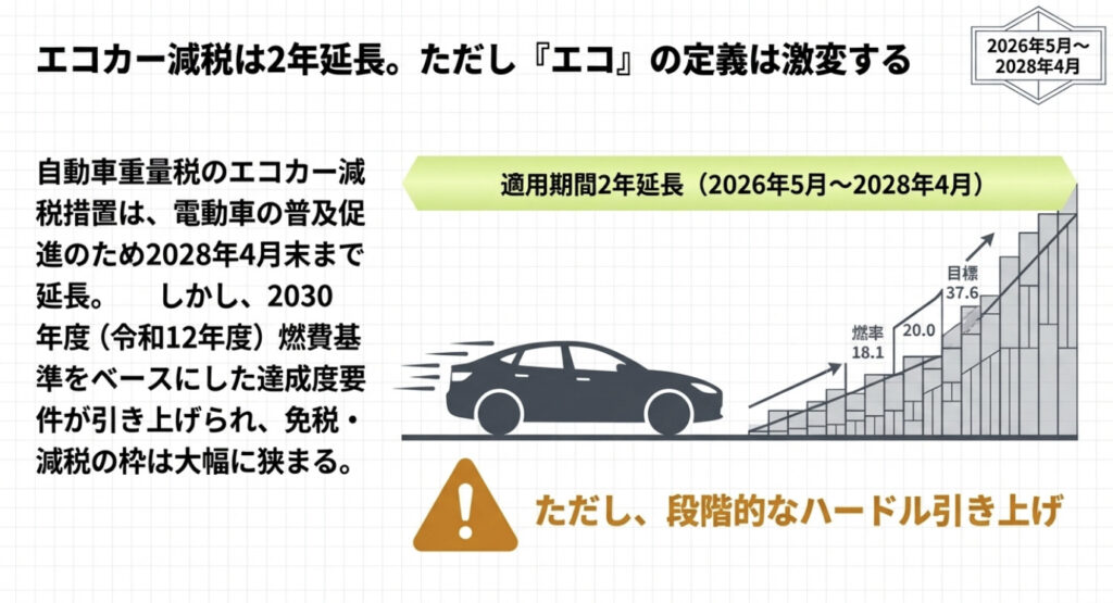 自動車重量税を軽減する「エコカー減税」は、2026年4月末で終了予定でしたが、2028年4月末まで2年間の延長が決定しました。ただし、ここには要注意ポイントがあります。