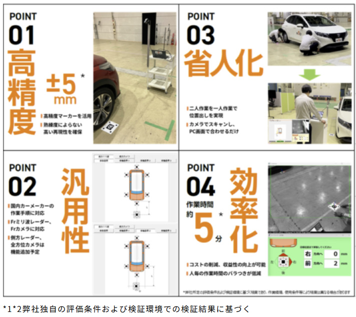 - SoloSet™は、この「メーカーごとの壁」を打ち破り、フロントミリ波レーダーやフロントカメラの位置出しにおいて、このシステム一つで幅広い車種に対応できるようになることを目指しています。これにより、導入コストの抑制、作業手順の統一化、そして整備士の教育負担軽減にもつながります。