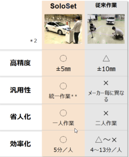 この比較表から、SoloSet™が単なる作業の効率化にとどまらず、自動車整備の品質そのものを根本から向上させるシステムであることが明確に見て取れます。