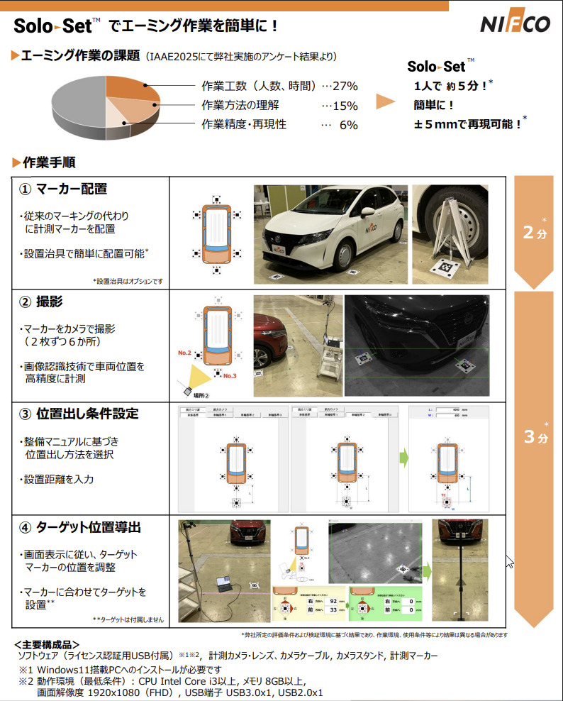 整備業界が直面する「人手不足」と「高度化する整備ニーズ」という相反する課題に対し、株式会社ニフコが開発したSoloSet™は、まさに救世主となり得るシステムです。その名の通り、「一人(Solo)」で「セットアップ(Set)」が完了するというコンセプトは、現在の整備現場が抱える根深い問題に対する明確な回答を提示します。