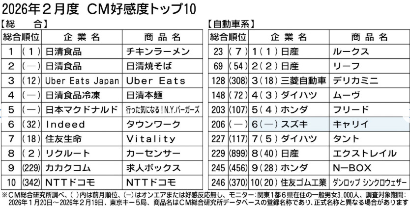 <2026年2月度 自動車業類 CM好感度ランキング(抜粋)>