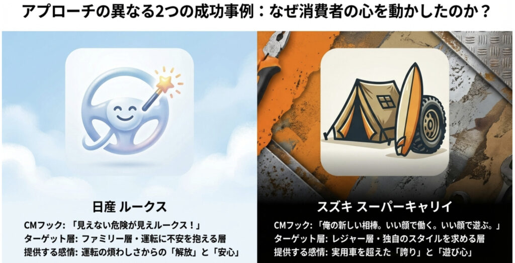 これらのランキング結果から見えてくるのは、単に新しい技術やデザインをアピールするだけでなく、「消費者のライフスタイルにどう寄り添うか」「どんな感情的価値を提供できるか」という点が、CM好感度を大きく左右する時代になったということです。次のセクションからは、日産ルークスとスズキキャリイのCM戦略を、より深く掘り下げていきます。