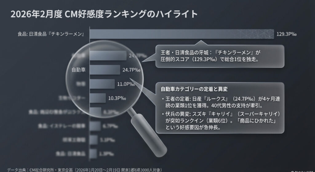 2026年2月度のCM好感度調査(2026年1月20日〜2月19日実施)は、自動車業界に携わる者として非常に注目すべき結果を提示しました。この期間に放映された全2,364銘柄の中で、日清食品の「チキンラーメン」が圧倒的なスコアで総合1位を獲得したことは既に触れましたが、日清食品は「日清焼そば」「日清本麺」も上位に送り込み、まさに「食品業界の雄」としての存在感を示しました。