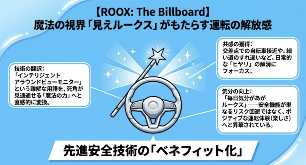 単に機能があることを伝えるだけでなく、「それによって何が得られるか(安心感)」を明確に示している点が、ルークスのCMの巧みさです。技術的なスペックではなく、それがもたらすベネフィットを強調することで、幅広い層のドライバーに響くメッセージとなっています。
