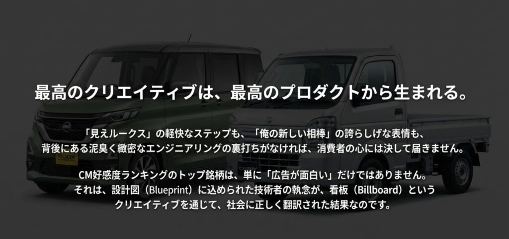 2026年2月のCM好感度ランキングは、自動車業界にとって非常に示唆に富む結果となりました。日産「ルークス」が「先進の安心と上質」を、そしてスズキ「キャリイ」が「働く・遊ぶを支える相棒感」をそれぞれ見事に表現し、高い評価を獲得しました。この二つの成功事例から、現代のCM戦略、ひいては製品開発において、非常に重要な共通点が見えてきます。