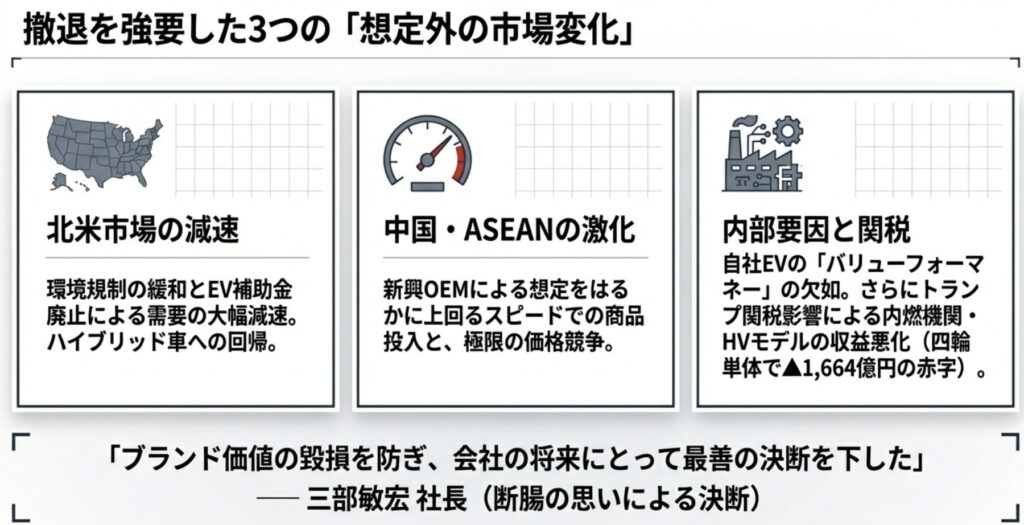 北米ではトランプ政権によるガソリン車規制の緩和やEV補助金の廃止(IRAの影響)が重なり、EV市場の成長が急速に鈍化した。一方、中国やASEAN市場では新興OEMが想定を大幅に上回るスピードで知能化・電動化を進め、ホンダは「バリュー・フォー・マネー(価格に見合った価値)」で真っ向から対抗できなくなっていた。