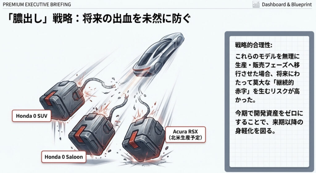 ここで重要な視点がある。4〜12月期の四輪事業は確かに営業赤字に転落しているが、EV関連の一過性費用や関税影響を除いた「実質的な営業利益」は前年同期比でプラス0.8%を維持しているのだ。つまり、今回の赤字の多くは「将来の負担の前倒し計上」であり、ホンダの骨格そのものが腐食しているわけではない。これが「膿出し」と呼ばれる所以である。