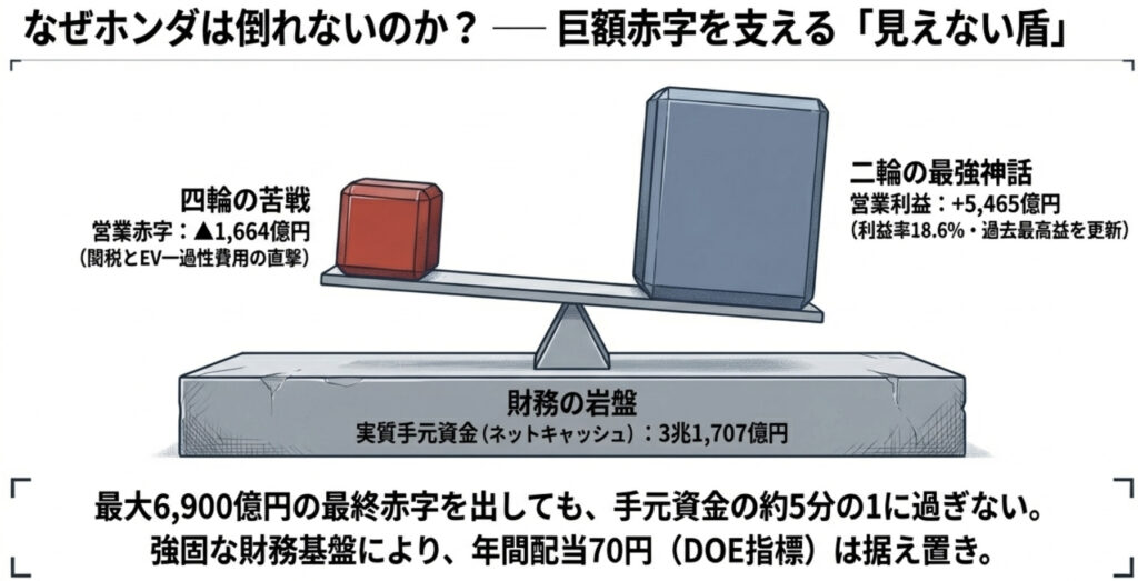 二輪事業の安定した稼ぐ力こそが、四輪が「膿出し」に踏み切れた財務的な背景だ。3兆円を超えるとされるネットキャッシュ(実質手元資金)の厚みも、この二輪収益が支えてきた部分が大きい。