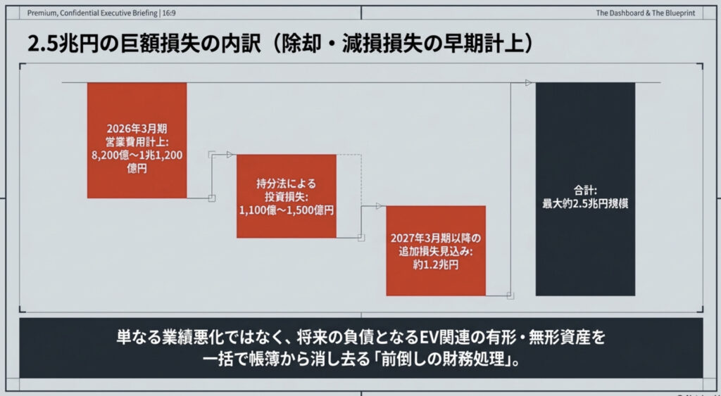 最大の要因は、北米で生産・販売を予定していた電気自動車「ゼロシリーズ」など3車種の開発・発売中止を決定したことである。この戦略見直しに伴い、将来の損失を前倒しで清算する「膿出し」として、2026年3月期の連結業績において8200億円〜1兆1200億円の営業費用を計上、さらに約1100億円〜1500億円の持分法による投資損失も発生する見込みだ。