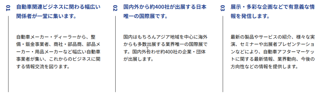 この展示会には、自動車メーカーやディーラーはもちろんのこと、整備・鈑金事業者、商社、部品商、さらには部品・用品メーカーまで、実に幅広い層が参加します。本展の主な特徴は以下の通りです: