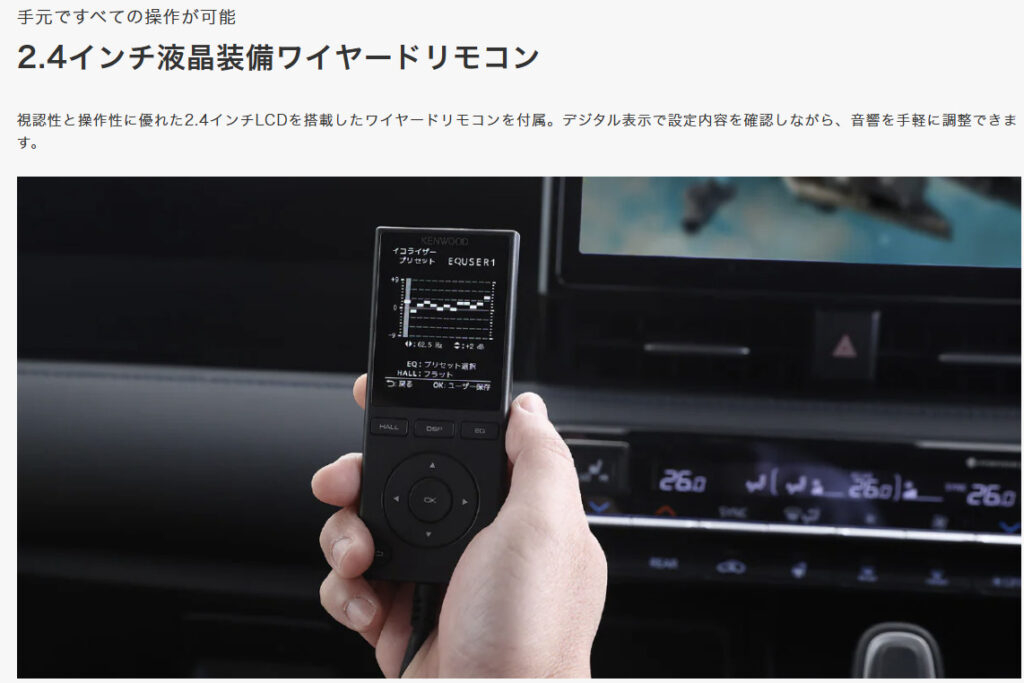 付属の2.4インチLCDディスプレイ搭載専用リモコンにより、手元で音響設定をリアルタイムに調整することができます。イコライザーカーブの確認やリスニングポジションの切り替え、K2テクノロジーのオン/オフ切り替えなど、運転中でも視認しやすい専用インターフェースは、実用性の面で高く評価できるポイントです。