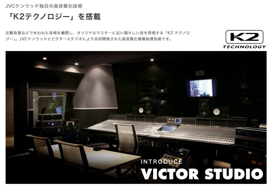 「K2」は、1987年に日本ビクター(現・JVCケンウッド)とビクタースタジオにより共同開発された音源のデジタル化における高音質化情報処理技術です。中でも一番の特長は、音楽制作のプロフェッショナルであるビクタースタジオのエンジニアによる試聴チェックを繰り返して開発されたことです。ビクタースタジオ所有の膨大なオリジナルマスター音源を素材に、音質や音楽的クオリティーを熟知したスタジオエンジニア達の音質評価をクリアし、限りなくマスター音源の忠実な再生を目指した技術が「K2テクノロジー」です。 JVCKENWOOD