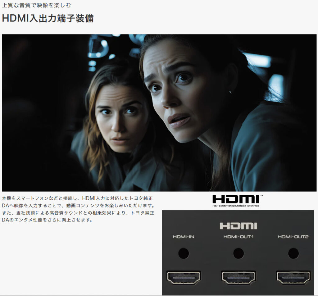 さらに見逃せないのが、HDMI入出力機能の装備です(※純正HDMI装着車のみ)。本機をスマートフォンなどと接続し、HDMI入力に対応したトヨタ純正DAへ映像を入力することで、動画コンテンツをお楽しみいただけます。また、当社技術による高音質サウンドとの相乗効果により、トヨタ純正DAのエンタメ性能をさらに向上させます。 Kenwood