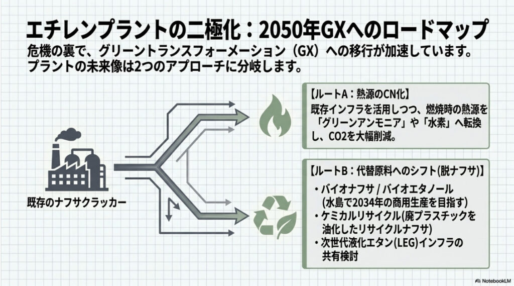 危機の裏側で、日本の素材産業は2050年のカーボンニュートラル(CN)に向けた「グリーントランスフォーメーション(GX)」を加速させています。2050年を見据えたエチレンプラントの将来像は、主に2つの方向に分かれます。