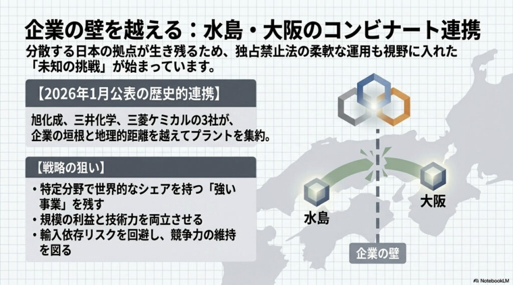 今回の再編で特に注目すべきは、2026年1月に公表された水島(岡山県)と大阪の拠点を跨いだ連携です。旭化成、三井化学、三菱ケミカルの3社が、企業の垣根を越え、さらに地理的な距離さえも越えてプラントを集約しようとしています。拠点が分散する日本において、将来的に生き残るために「越えなければならないハードル」を先行して突破しようとする、極めて意義深い取り組みです。