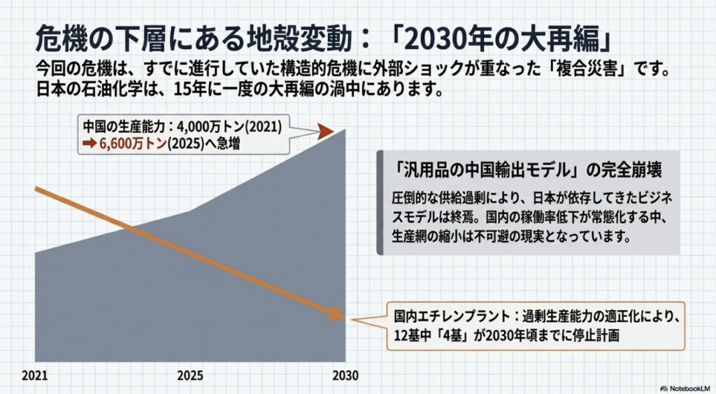 今回のナフサ危機は、日本の石油化学産業がすでに直面していた構造的危機に、中東情勢という外部ショックが重なって起きた「複合災害」です。もともと日本の石油化学は、「15年に一度」と言われる歴史的な大再編の真っ只中にありました。